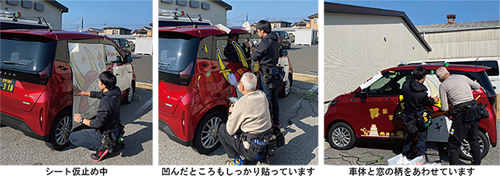 車体には曲面・凸凹面面に追従し、粘着面に細かな格子状のエア抜け溝を設けたシートを使用し、